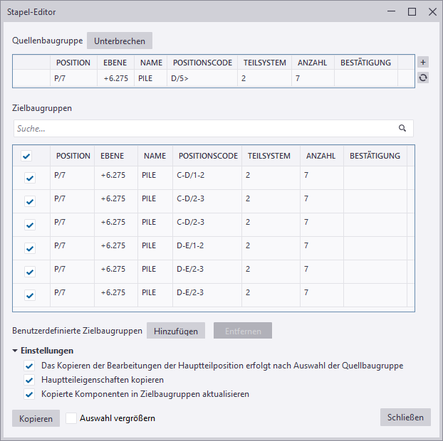 Das Kopieren der Bearbeitungen der Hauptteilposition erfolgt nach Auswahl der Quellbaugruppe