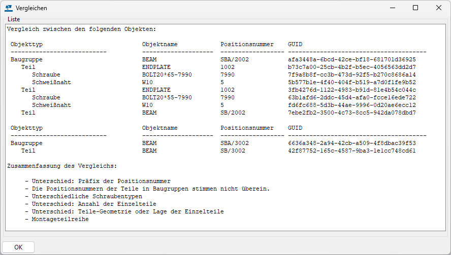 Tekla Structures zeigt die Ergebnisse in der Statusleiste an und öffnet eine Liste mit weiteren Angaben. Sie könnten beispielsweise eine Meldung erhalten, dass sich die Teilgeometrie unterscheidet oder dass Teile in der Baugruppe unterschiedlich platziert sind.