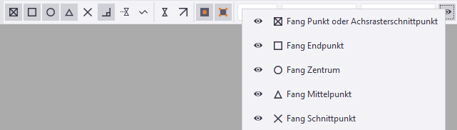 Sie können die Symbolleisten Selektionsschalter, Fangfunktionen und Übergeordnete Fangfunktion-Einstellungen anpassen, indem Sie einige der Schalter ausblenden. Sie können die Symbolleisten im Modellierungsmodus und im Zeichnungsmodus anpassen.