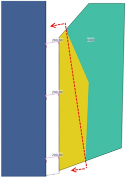 Der Spaltabstand wird in der Richtung senkrecht zur Nebenteilfläche gemessen, die in der Abbildung unten mit der gestrichelten Linie dargestellt ist. Nachdem die Richtung des Spalts definiert wurde, wird derselbe Spalt entlang der Hauptteilfläche angebracht. In diesem Beispiel ist der Abstand 200 mm.
