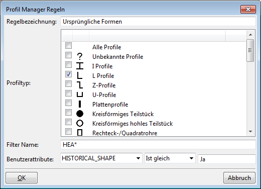 gruppiert, z. B. Profiltyp (z. B. I-Profile) und der Profilquerschnitt (z. B. HEA). Die Art und Weise der Gruppierung von Profilen in der Profil-Baumansicht können Sie über die Regeln ändern.