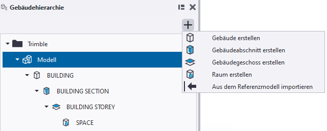 Die Befehle zum Erstellen aller Elemente der Gebäudehierarchie befinden sich ebenfalls Menü des Seitenbereichs Gebäudehierarchie. Zum Erstellen einer Gebäudehierarchie im Modell klicken Sie auf die Schaltfläche