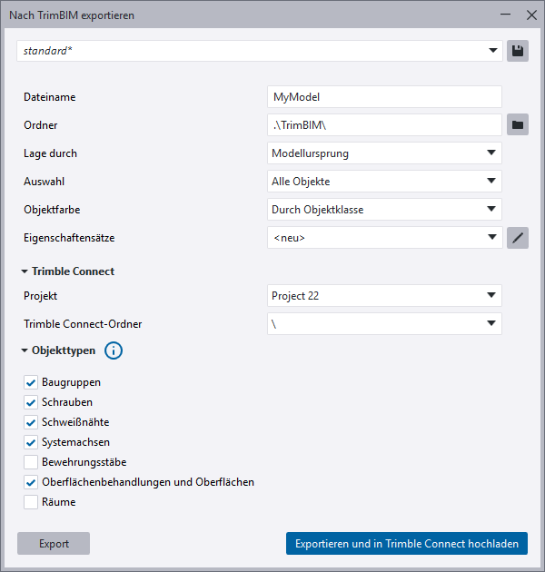 - Nie = Das freigegebene Modell wird nie in den eingestellten Trimble Connect-Projektordner hochgeladen.