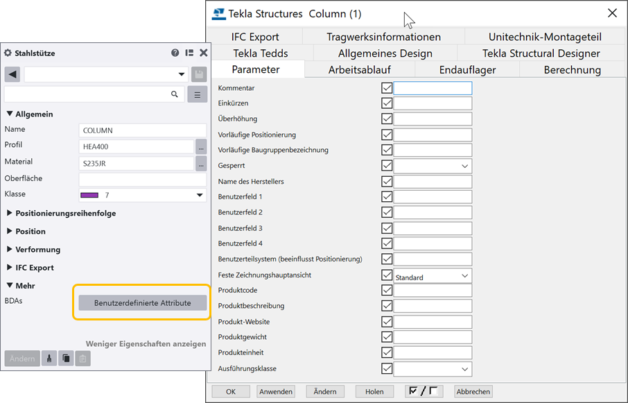 Der Eigenschaftenbereich und viele Dialogfelder enthalten benutzerdefinierte Attribute (BDA) für diverse Objekte, darunter Träger, Stützen, Schrauben und Zeichnungen. Tekla Structures zeigt diese Felder an, wenn Sie auf die Schaltfläche Mehr im Eigenschaftenbereich oder auf die Schaltfläche Benutzerdefinierte Attribute im Eigenschaftenbereich oder im Dialogfeld klicken.