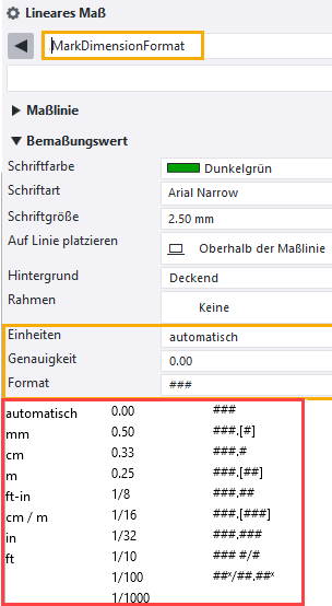 Obere Ebene übernimmt die Einheit und Genauigkeit aus der Bemaßungseigenschaftendatei MarkDimensionFormat.dim. Sie können in einer geöffneten Zeichnung die in MarkDimensionFormat.dim über den Eigenschaftenbereich für Bemaßungen gespeicherten Einstellungen ändern.