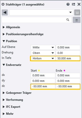 In den folgenden Beispielen wurde das Teil mit spezifischen Positionseinstellungen (Auf Ebene, Drehung, In Tiefe) und Endversatzeinstellungen (dx, dy, dz) erstellt.