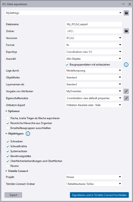 Anstatt eine IFC-Datei zu exportieren, können Sie auch eine IFC-Datei exportieren und sie direkt auf Trimble Connect hochladen. Anweisungen hierzu finden Sie weiter unten.