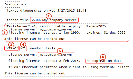Beispiel für Anbieternamen und -pfad: Anbietername: tekla Path: 27007@myserver (Port und Lizenzserver-Computername/Hostname) Der Herstellername, der für den Tekla-Lizenzserver verwendet wird, lautet tekla (nur Kleinbuchstaben). Um der Statusliste auf der Registerkarte Serverstatus einen Lizenzvergabedienst hinzuzufügen, geben Sie die Anbieterdaten in den Textfeldern Name des Anbieters und Pfad ein und klicken auf Anbieterpfad hinzufügen. Zur ausschließlichen Anzeige von Angaben zu bestimmten Lizenzservern in der Statusliste geben Sie die Anbieterdaten in den Feldern Vendor Name und Path ein und klicken auf Override Path, um die in der Statusliste angezeigten bestehenden Lizenzserver zu ersetzen. Über die Schaltfläche List All Vendor Paths werden alle Lizenzvergabedienste aufgeführt, zu denen Sie nähere Informationen auf der Registerkarte Server Status in der Statusliste finden. |