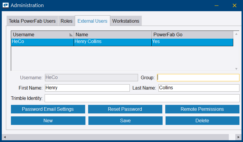 Username * The username with which the external user logs in to Tekla PowerFab.