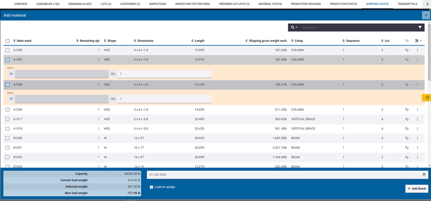In Tekla PowerFab Go, you can view the shipped and unshipped loads in a job, add loads, modify the material items on loads, create and view bill of lading reports, ship loads, and return shipped items.