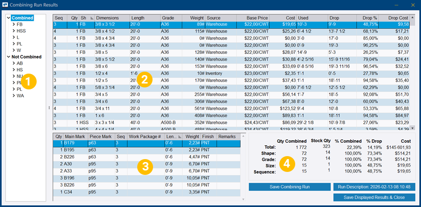 (4) Summary area: Combining results with the total number of bars of the selected length, waste percentage and total material costs. The material cost represents the pricing of the materials in the pricing database that was used in the combining run.