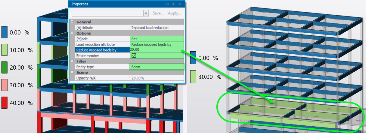 Reduce imposed loads by - using this you can manually apply specified reduction % values using mouse operations as illustrated in the picture below. As this shows, you can use two adjacent 3D Structure views - one in Review mode and one in Set mode - to simultaneously view the applied reductions as a guide in one while manually making adjustments in the other.