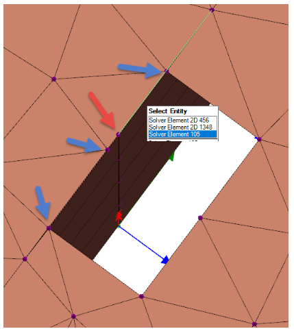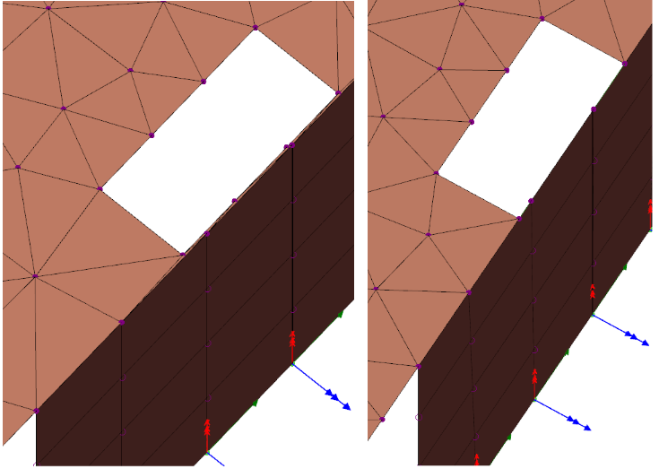 In this case the opening is defined with an edge that is approximately 4mm from the insertion line of the wall. With the Hardpoint to edge distance tolerance at the default of 5mm this creates a model that is poorly connected along the edge of the opening. The node highlighted in red is not included in the slab meshing (because it is just 4mm away from the edge). The 3 slab nodes highlighted in blue are not directly connected to the wall.