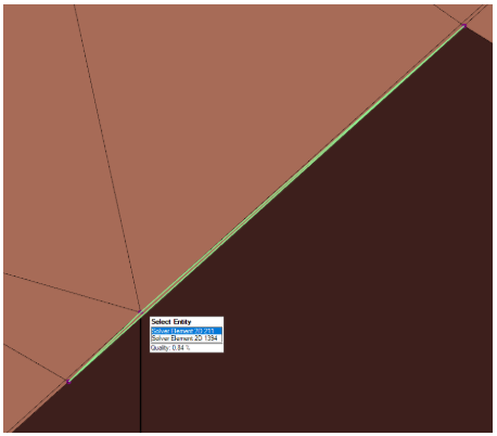 In this example the slab edge sits just a few mm outside the column corner. The view above left shows analysis model where a very poor quality element runs past the corner, (you would only end up with this model if the Column boundary to slab edge merging distance were to be set less than the default 5mm. The view above right shows the model you get if the merging distance is set to the default 5mm or above. One column corner node merges (moves to) the slab edge eliminating the narrowest part of strip.