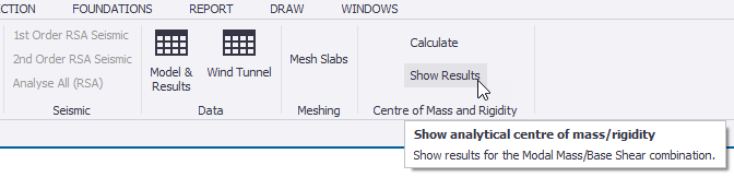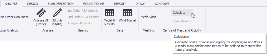 Provided that at least one modal mass combination (either "modal mass" or "base shear" type) has been defined, the analytical approach is initiated from the Analyze ribbon by clicking Calculate in the Centre of Mass and Rigidity group.
