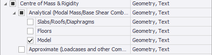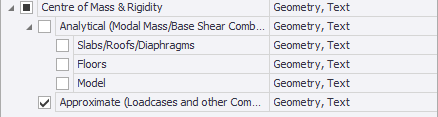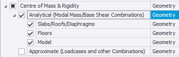 Tekla Structural Designer provides two alternative approaches for these calculations: an analytical approach, which is only performed for "modal mass" and "base shear" combinations; and an approximate approach, which is available for loadcases and other combinations, but not "modal mass" and "base shear" combinations.