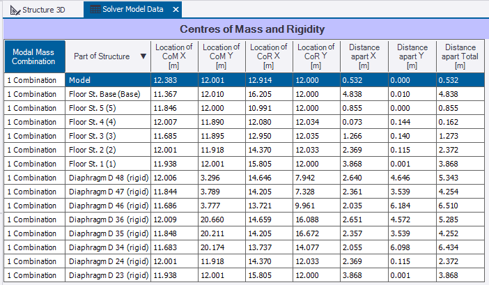For meaningful results, each modal mass combination should accurately represent the structural state for which CoM and CoR are required (e.g., the seismic weight combination for seismic situations).
