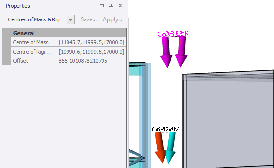Selecting a CoM or CoR in the graphical view will display their coordinates in the Properties window.