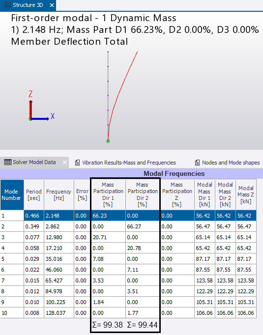 So in summary; modal analysis in Tekla Structural Designer is an idealized solution which finds the natural frequencies of a structure that does not consider damping or dynamic loading 'input' to your structure, which may occur in the real world. The results it produces are a list of modes - in order of ascending frequency - together with their: frequency; period; mass participation % and modal mass.