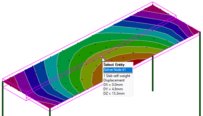 In the resulting FE solver model, since vertical offsets are not structurally significant the analysis mesh is formed at the same level relative to the top of the slab. The mesh properties do however reflect the change to the slab thicknesses in the different slab areas.
