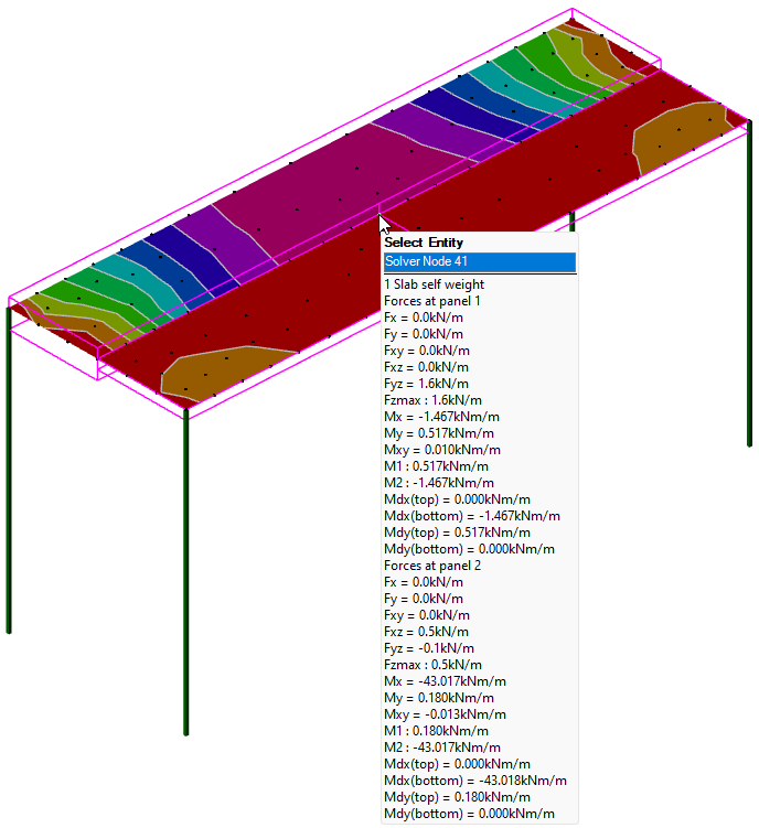 The mesh of shell 2D solver elements is always created in the same plane, irrespective of whether slabs have different thicknesses, slabs items have been raised/lowered via vertical offsets, or column drops have been applied. Shells are not created inside slab openings and any loads placed within openings are not applied to the model.