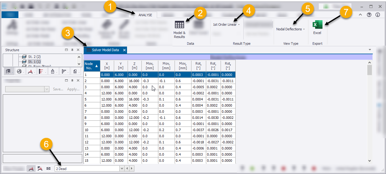 To display tabular model and results data, first go to the Analyze ribbon (1).