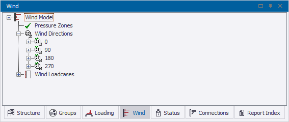 The Wind window, which can be opened and closed from the Windows ribbon, is used after completing the wind modeling process to display wind direction views, modify wind directions, and modify wind loadcases.