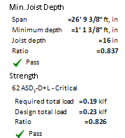 Strength: Based on major shear and major flexure. For K, LH, DLH, this compares the "Required Load" to the "black value" (strength safe load) from SJI tables or calculated values for short spans. For KCS, this compares actual shear and moment to shear and moment capacity, and also checks the maximum uniform load over any sub-length.