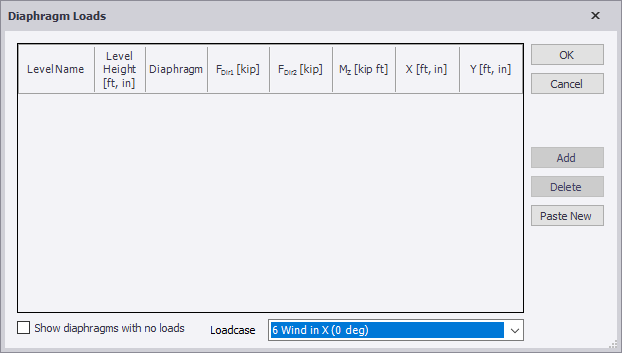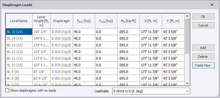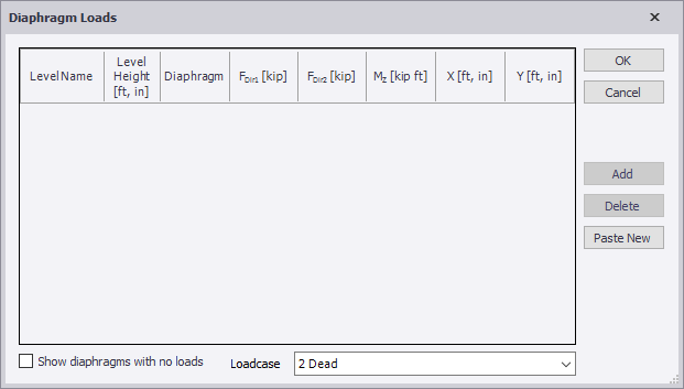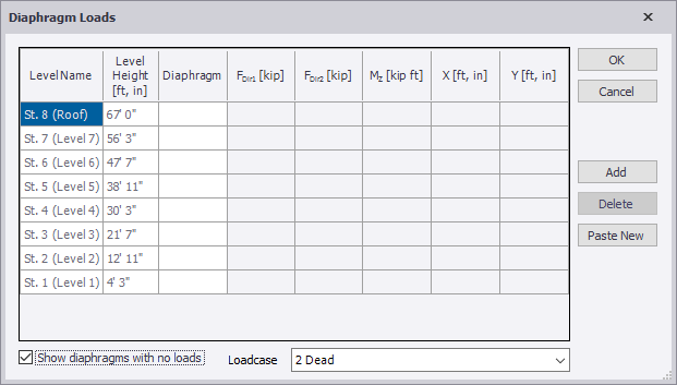 If you have multiple loads to apply at different levels, the Diaphragm Table of loads provides a quicker means of doing this - either by typing the loads and their positions directly into the table, or by pasting the data into the table from a spreadsheet.