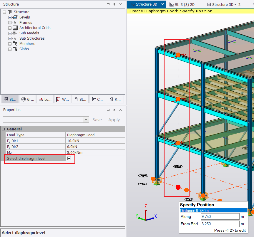 Add a diaphragm load in a 3D view by selecting the diaphragm level