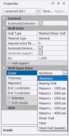 Select one or more bearing wall and then use the Properties window to view and modify their properties.