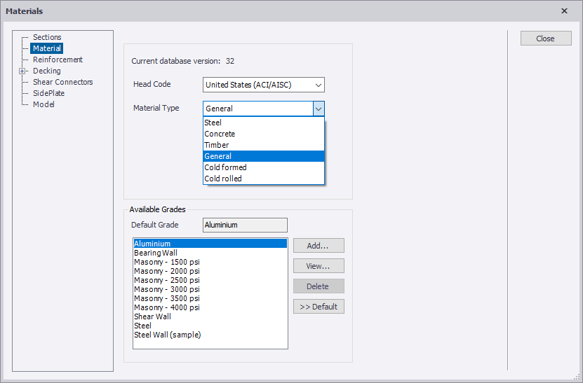 If the grade you want to use is not listed, you can open the Materials dialog and add the grade to the database, taking care to first select the General material type as shown below.