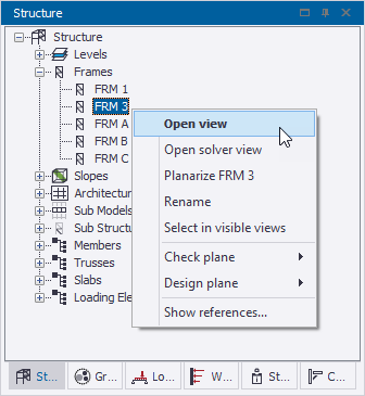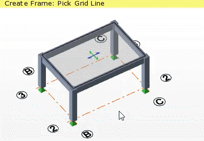 A frame is a 2D view of the model, created in a vertical plane defined by an existing grid line. Since only the members that lie within the plane of the frame are displayed, a frame view can be particularly useful for defining bracing.
