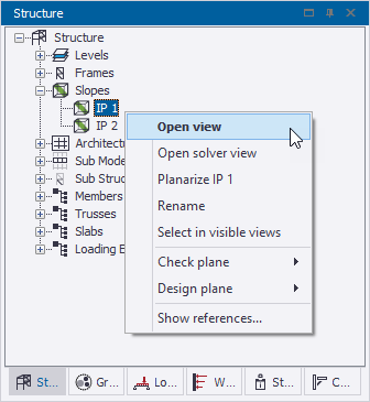 A slope is a 2D view of the model, created in an inclined plane. You can define a slope by selecting 3 existing grid points. Since only those members that lie within the plane of the slope are displayed, this type of view can be particularly useful for defining inclined roofs and ramps.