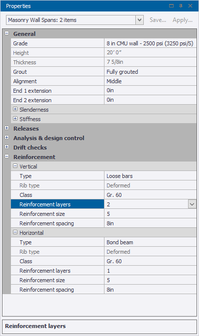 - In the Properties window increase the vertical Reinforcement layers from 1 to 2 and the