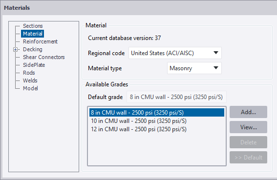 There are three built-in masonry material grades in Tekla Structural Designer for the US regional code.