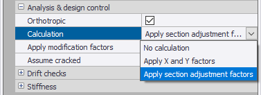 - Ungrouted - with this option the wall is forced to have orthotropic properties, with the calculation method defaulting to Apply section adjustment factors. The other two calculation methods are also available for selection.
