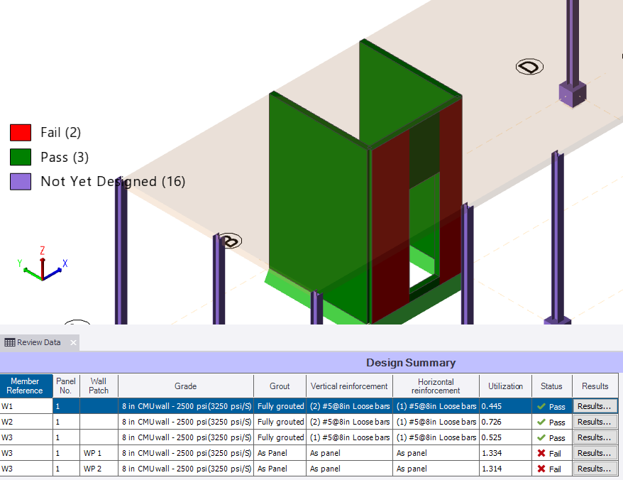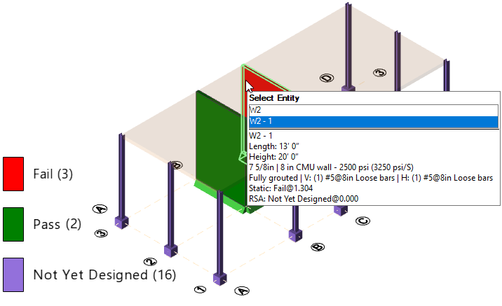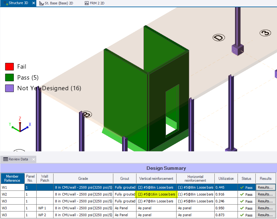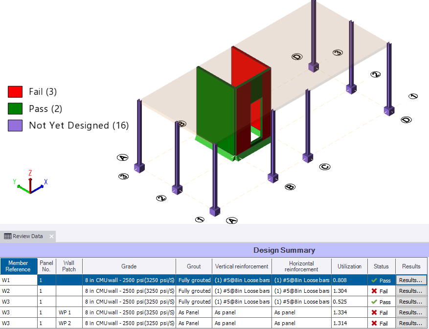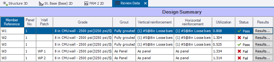 The default reinforcement for W2 and W3 is insufficient and will need to be updated in the Properties window, after which the failing walls can then be individually rechecked.