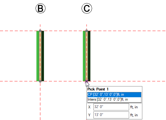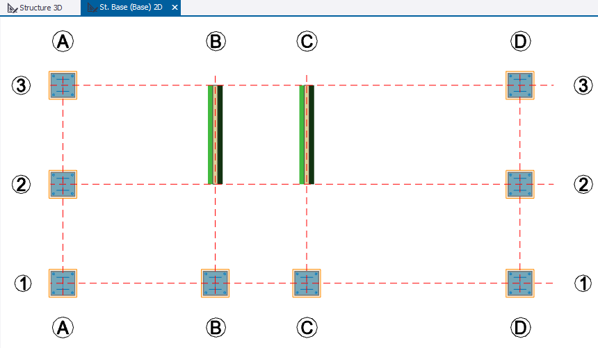 To place a new wall, in the St. (Base) 2D view, pick point 1 as grid point B/2