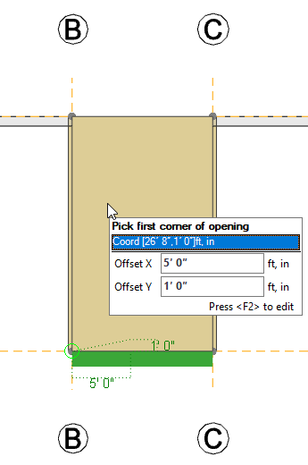 To pick the first corner, press [F2], enter Offset X as 5' and Offset Y as 1', then click on the wall.