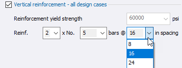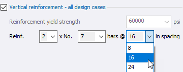 - Edit the vertical reinforcement, by increasing the bar spacing from 8 to 16 in.
