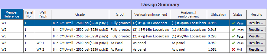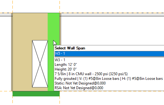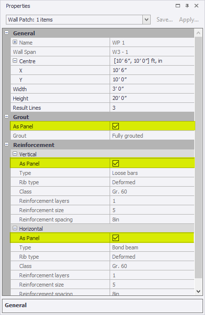 When a patch is created the grout and reinforcement information all default to “as panel”, matching the grout and reinforcement spacing of the panel. For narrow wall patches, where the wall patch width is smaller than the wall panel reinforcement spacing, the wall patch should specify smaller reinforcement spacing to ensure the design will execute.