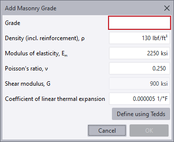 Define Masonry Grade without using Tedds:If you don't have a Tedds license, you can still define and analyze masonry walls, but you will need to define your masonry grades without using Tedds. To do this click the Add... button and manually enter the properties in the Add Masonry Grade dialog.