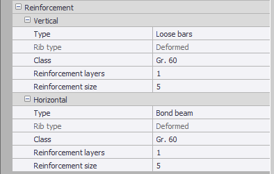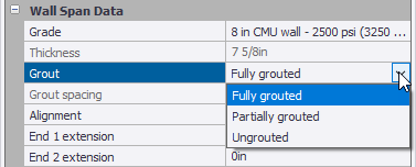 - Partially grouted - after selecting this option you should then also specify the grout spacing. With this option the wall is forced to have orthotropic properties, with the calculation method defaulting to Apply section adjustment factors. The other two calculation methods are also available for selection.