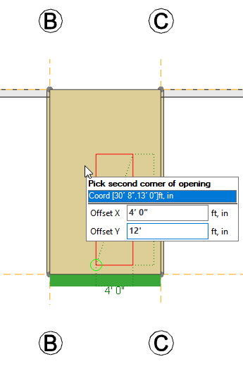 To pick the second corner, press [F2], enter Offset X as 4' and Offset Y as 12' then click on the wall again.