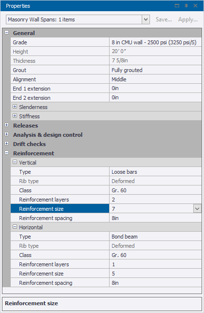 You can rapidly check all the masonry wall panels in the model using the initial default reinforcement properties or define your own starting point for all walls as follows:
