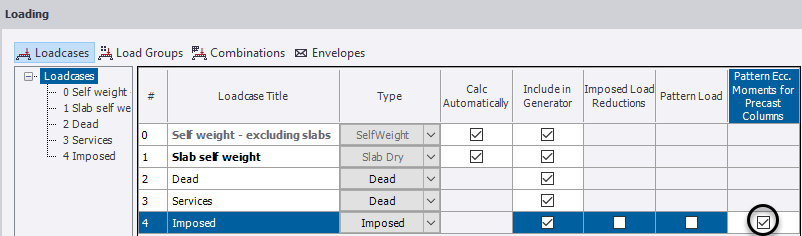 When eccentricity moment patterning is enabled you must then indicate which of the live cases are to be patterned, (you may for example decide not to pattern storage loads.)