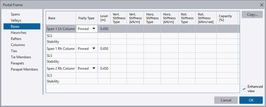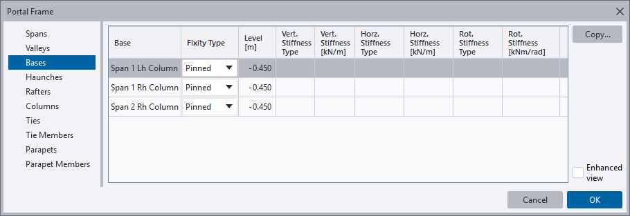 You can define each base in your frame as being pinned, fixed or spring and give the associated details on the Bases page of the Portal Frame dialog box.