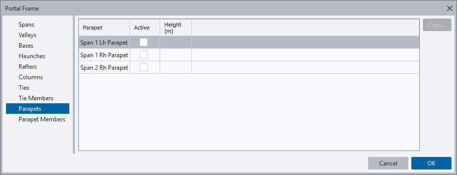 You can add eaves parapets from the Parapets page of the Portal Frame dialog box.