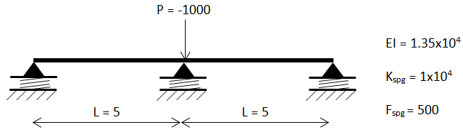 A 10 long continuous beam is simply supported by three translational springs as shown. All springs have a maximum resistance force of 500. Calculate the reaction forces and deflection at each support.